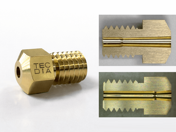 GF入り材料やスーパーエンプラなど、ノズル負荷が大きい材料を用いる産業用途においても、長期間安定して使用できる耐摩耗性能を完備。一体加工ノズルで、3020HVの硬さを実現し、造形精度と耐摩耗性を両立します。宇宙開発・自動車業界にも導入実績を持つ、日本の加工技術を結集したノズルです。