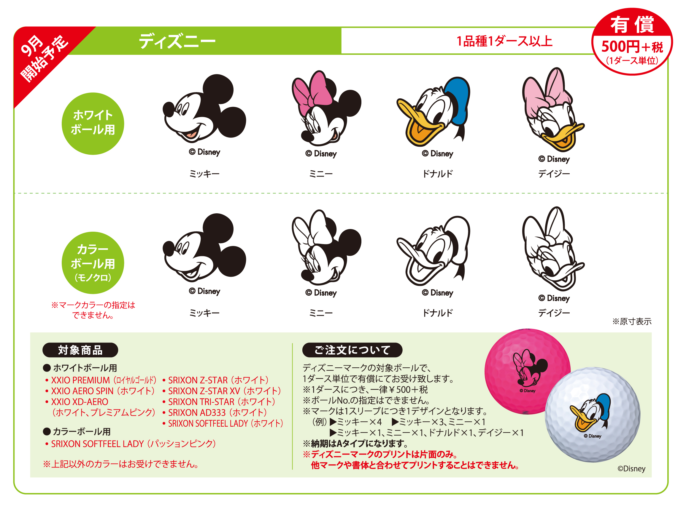 ダンロップスポーツ(株)は、従来からゴルフボールに無料※1で名前やマークを入れる「オウンネームサービス」をしていますが、このたびディズニーマークも1ダースにつき500円+税でプリントできるサービスを開始します※2。9月5日より店頭で受注を開始し、10月31日まではサービス開始キャンペーンとしてサービス料は無料です。