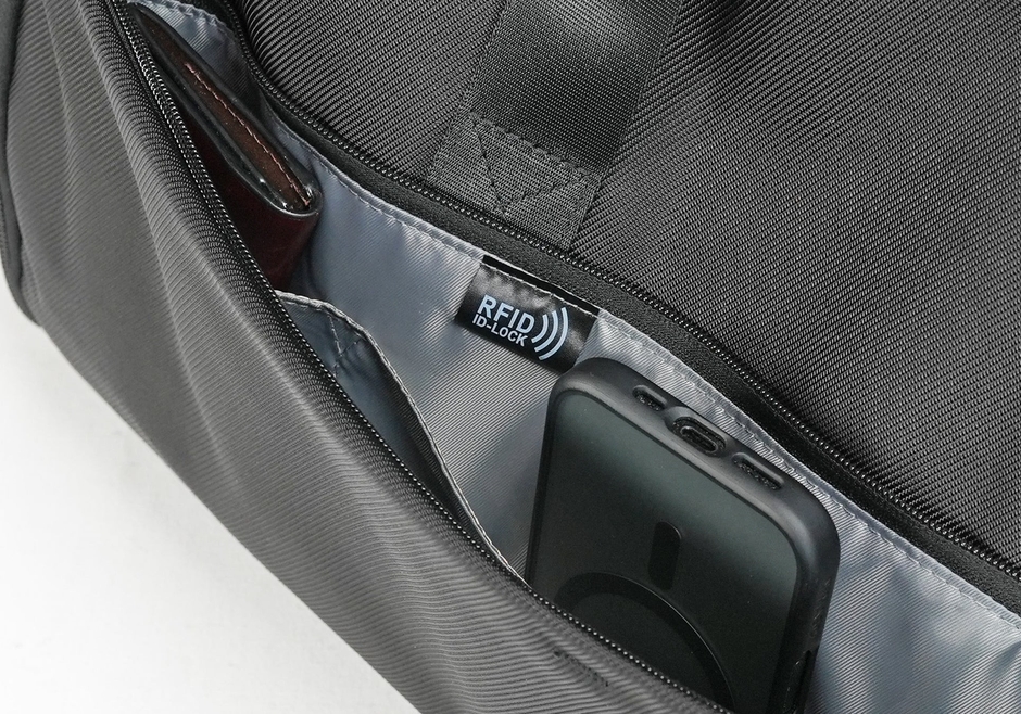 フロントポケットには、パスポートやクレジットカードのデータをスキミングから防ぐ、RFIDブロック機能を搭載。小物が取り出しやすいイージーアクセスポケット構造になっているため、機密性の高いデータを守りつつ、移動中もスムーズに中身を取り出せます。