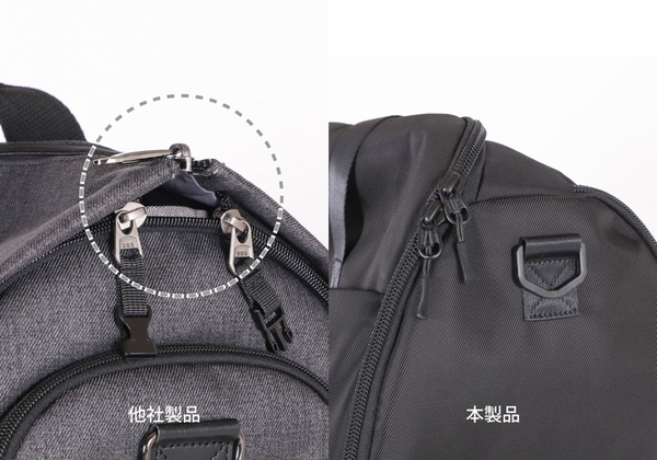開閉負荷のかかるすべてのジッパーにYKKメタルファスナーを採用し、耐久性を確保。さらに、ジッパーを複数本使用せず一本型にすることで、組み立て時に発生する隙間が最小限となり、雨水やほこりなどの侵入を防ぎます。
