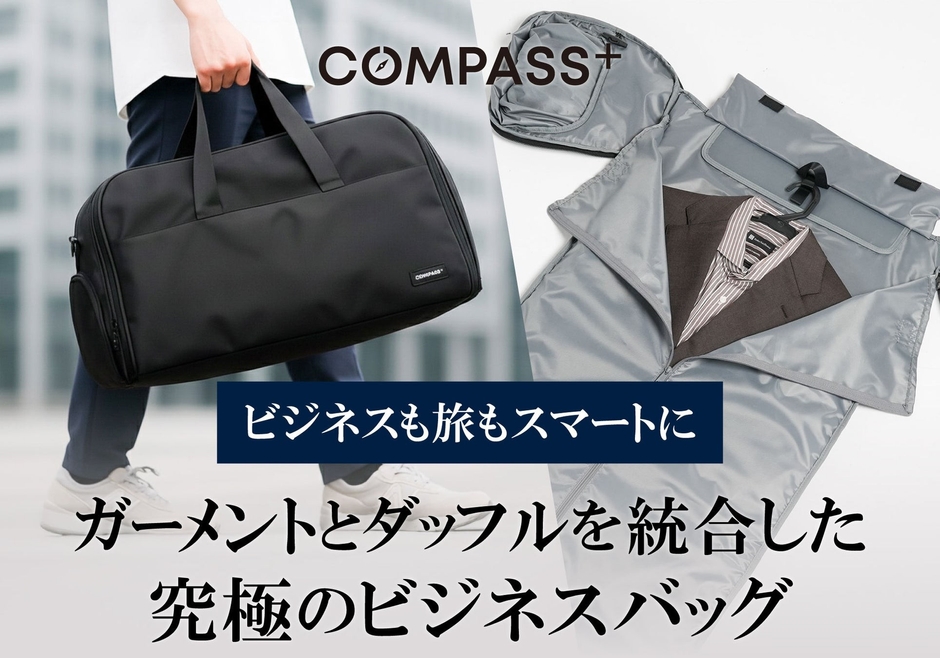 短期出張や週末の冠婚葬祭など、スーツやジャケットが必須のシーンにおいて「着替えや靴を入れるバッグ」と「シワ防止のガーメントバッグ」の2つを持つ煩わしさは、ビジネスマン共通の課題でした。また、バッグの中で大切な一着にシワがついてしまうストレスも少なくありません。COMPASS+は、こうしたビジネスシーンにおける小さなストレスを解消し、『スーツも着替えも、1つのバッグでスマートに持ち運びたい』という想いを形にするため、機能性・デザイン・耐久性を兼ね備えた本製品「ガーメントダッフルバッグ」を企画・開発いたしました。