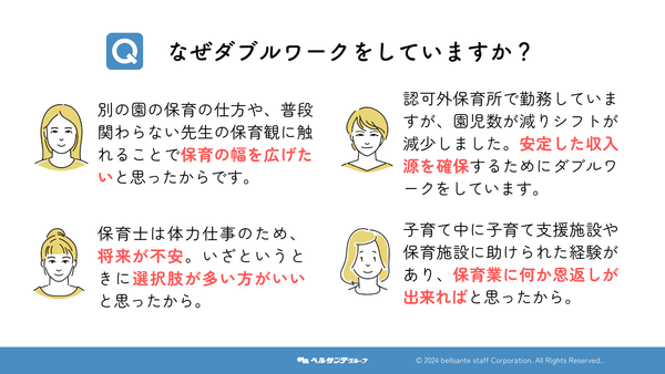 ・「家族の仕事を手伝うことになり退職を考えましたが、保育園から『短い時間でもいいので来てほしい』と言っていただいてダブルワークをすることになりました」