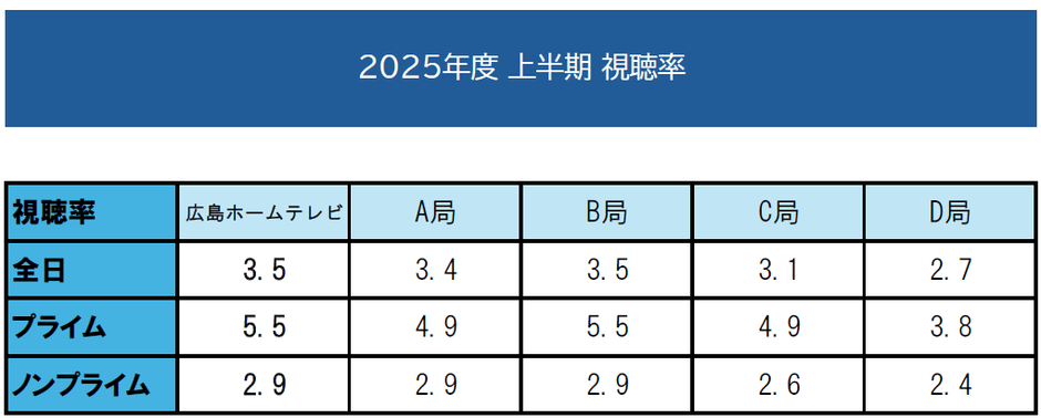 広島ホームテレビ(本社:広島市中区)は、2025年上半期視聴率(2025年3月31日~2025年9月28日)において、全日(6時~24時)で平均3.5%、プライム(19時~23時)で平均5.5%、ノンプライム(6時~19時/23時~24時)で平均2.9%と、いずれも1位を獲得しました。