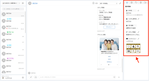 右側メニューから稼働中のステップ配信やリッチメニューの情報を一目で確認できるようになりました。