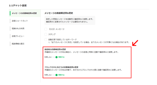 これらの設定をオンにすると、チャット返信時や友だちにブロックされた際に自動でメッセージを確認済みにできるため、メッセージ管理の手間を大幅に削減できます。