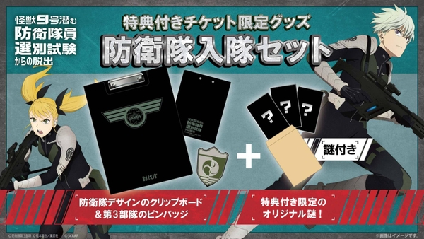 加えて本イベントでは通常チケットに加えて「特典付きチケット」の販売も決定! 「特典付きチケット」を購入すると、限定グッズ「防衛隊入隊セット」として防衛隊デザインのクリップボード&第3部隊のピンバッジと特典付き限定のオリジナル謎が付属します。防衛隊への入隊を目指す士気もより一層上がる本アイテムはファン必携。