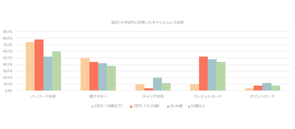 Z世代は、キャッシュレス決済の中で「バーコード決済」の利用率が最も高い。Z世代の中でも19歳以上の世代では、「クレジットカード」の利用率が高い。