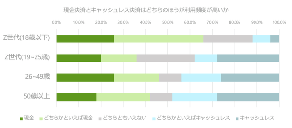18歳以下のZ世代では、キャッシュレス派よりも現金派の人の方が多い。一方で、19〜25歳のZ世代に着目すると、現金派が比較的少なくキャッシュレス派の人が比較的多い。Z世代の中でも18歳以下と19〜25歳の世代で差が生まれている。
