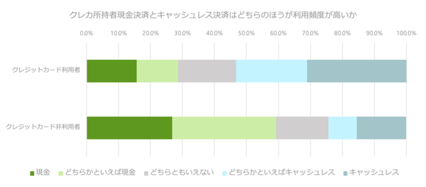 直近1ヶ月以内のクレジットカード利用者と非利用者に対し、現金・キャッシュレスの利用頻度はどちらの方が高いかを聴取した。
