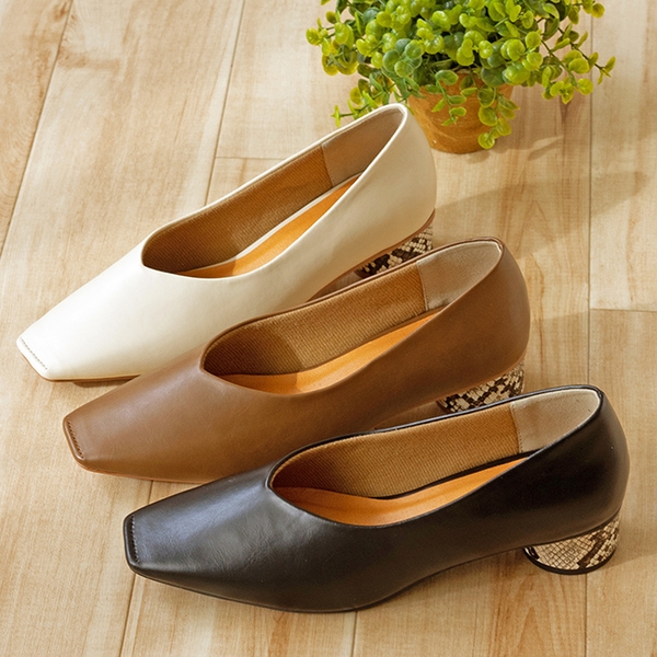 スクエアトゥ×変形ヒール×パイピング×コバでトレンド満載。