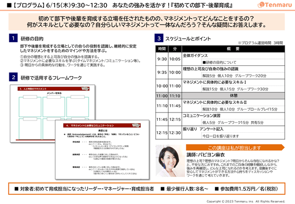 組織づくりや人材教育・キャリア開発、人材採用支援を行う株式会社Tenmaru(本社:東京都港区、代表取締役:諸戸 歩)は、2023年6月、中小企業で初めて部下育成に取り組む人を対象としたオンライン公開講座を行います。マネージャーとして必要なスキル・コミュニケーション方法に特化した内容を効率的に学べ、現場での実践につなげます。