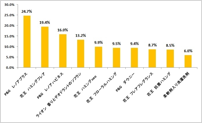さらに、普段から柔軟剤を使用している方にどのブランドを使っているのかを聞いたところ、1位は「P&G レノアプラス」で24.7%の方が使っていると回答しました。