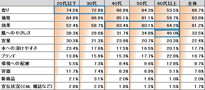 さらに、「肌へのやさしさ(46.0%)」や「ブランド(22.8%)」、「環境への配慮(12.8%)」などの項目で他の世代より高い数字となりました。