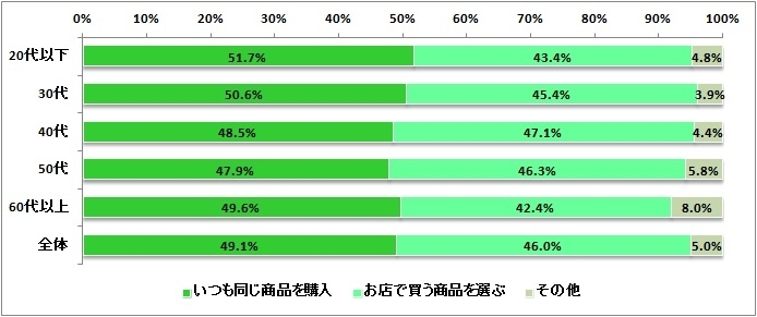 柔軟剤を購入する際に、お店でどのように選んでいるかを確認したところ、「いつも同じ商品を購入」との回答が49.1%、店頭で商品を選んでいるとの回答が46.0%でした。