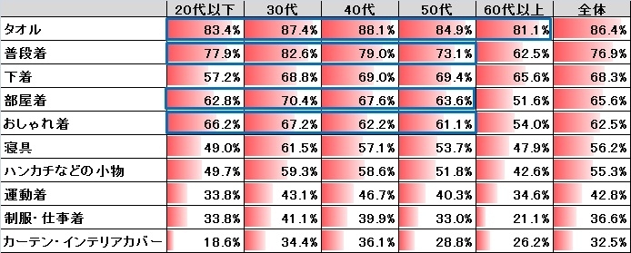 アンケートでは、どの洗濯物に柔軟剤を使用しているかも聞いていますが、全世代でタオルとの回答がもっとも多く、全体で86.4%でした。