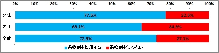 アンケートの回答者に、普段から柔軟剤を使用しているかを聞いたところ、女性では77.5%が、男性でも65.1%が使用すると回答、全体でも72.9%と7割以上の方が柔軟剤を使用していることがわかりました。