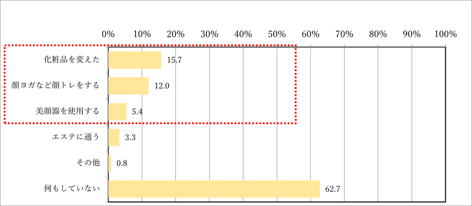 「化粧品を変えた」との回答が15.7%、「顔ヨガなど顔トレをする」12.0%、[美顔器を使用する]5.4% エステに通うなど近道な対策が。