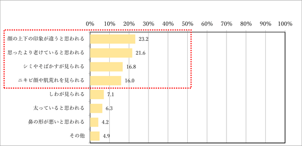 「顔の上下の印象が違うと思われる」23.2%、「思ったより老けていると思われる」21.6%、「シミやそばかすが見られる」 16.8%、「ニキビ顔が肌荒れを見られる」との回答者が16.0% 不安は、外見のコンプレックスにも。