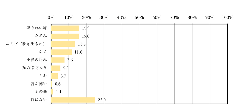 「ほうれい線」15.9%、「たるみ」15.8%、「ニキビ(吹き出もの)」13.6%、「シミ」11.6% やはりトップはほうれい線、僅差でたるみも。
