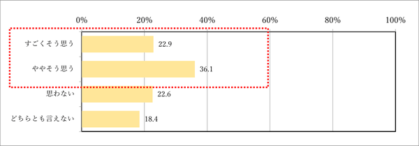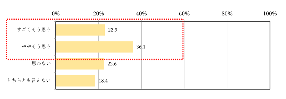 「すごくそう思う」との回答が22.9%、「ややそう思う」が36.1%で合計59%(合計569名)。マスク生活はわずらわしい一方でお顔のコンプレックスを隠す、手っ取り早い方法なのかもしれません。