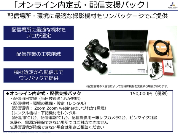 ・内容:オンライン配信に必要な配信・映像撮影機器を使用して「オンライン内定式」を支援するワンパッケージプラン