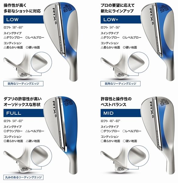 硬い砂や柔らかい砂のバンカーや深いラフなど、シビアなショットを求められる56°・58°・60°には「FULL」「MID」「LOW」の3種のグラインドを、54°・56°にはプロの要望に応えて「LOW+(プラス)」をラインアップしました。