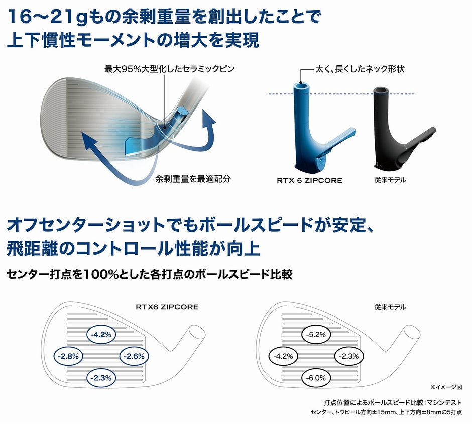 ネック部にインサートする軽比重のセラミックピンを大型化し、さらにロフト別に設計することでより大きな余剰重量を創出しました。打点位置に近い重心位置を実現するとともに、上下の慣性モーメントを増大させたことで飛距離安定性、方向安定性が向上しました。