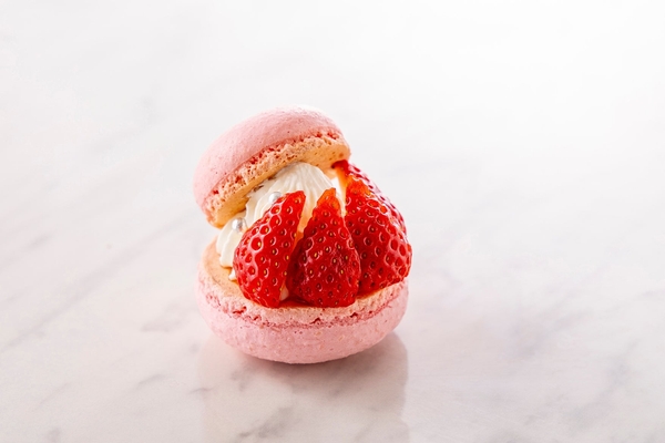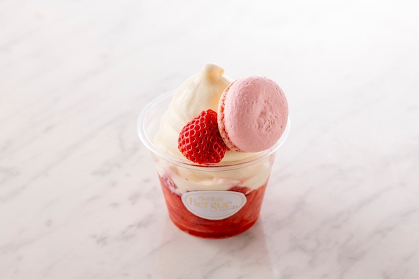 ベルグの4月オリジナルの木苺マカロン生地で独自ブレンドのふわふわ生クリームをたっぷりとサンドしたトゥンカロン。仕上げに国産いちごをトッピング。