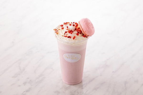 国産いちごを贅沢に使ったなめらかな口当たりのスムージー。独自ブレンドの生クリームとベルグの4月自慢の木苺のマカロンを添えて。