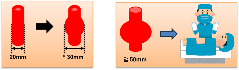 腹部大動脈は通常直径20mm程度の管状の血管ですが、腹部大動脈瘤患者さんでは一部が直径30mm以上のコブ状に膨れていき、最終的に破裂する危険性があります。大きくなるペースは人により様々で、悪化を防ぐ薬はありません。直径が50mm*を超えると破裂を予防する手術を行うか検討されていますが、基本的にはそれ以下の小さい腹部大動脈瘤に対して予防的手術は行われません(*海外の臨床試験で、55mmより小さい腹部大動脈瘤に手術をしても予後が良くならないことが知られています。日本では欧米諸国に比して手術の死亡率が低く、50mmからの早期の手術が計画されます)。