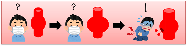 腹部大動脈瘤は大きくなっても気づかず、破裂して初めて強い症状が出ることがあります。破裂時の死亡率は極めて高く、80%程度と考えられています。