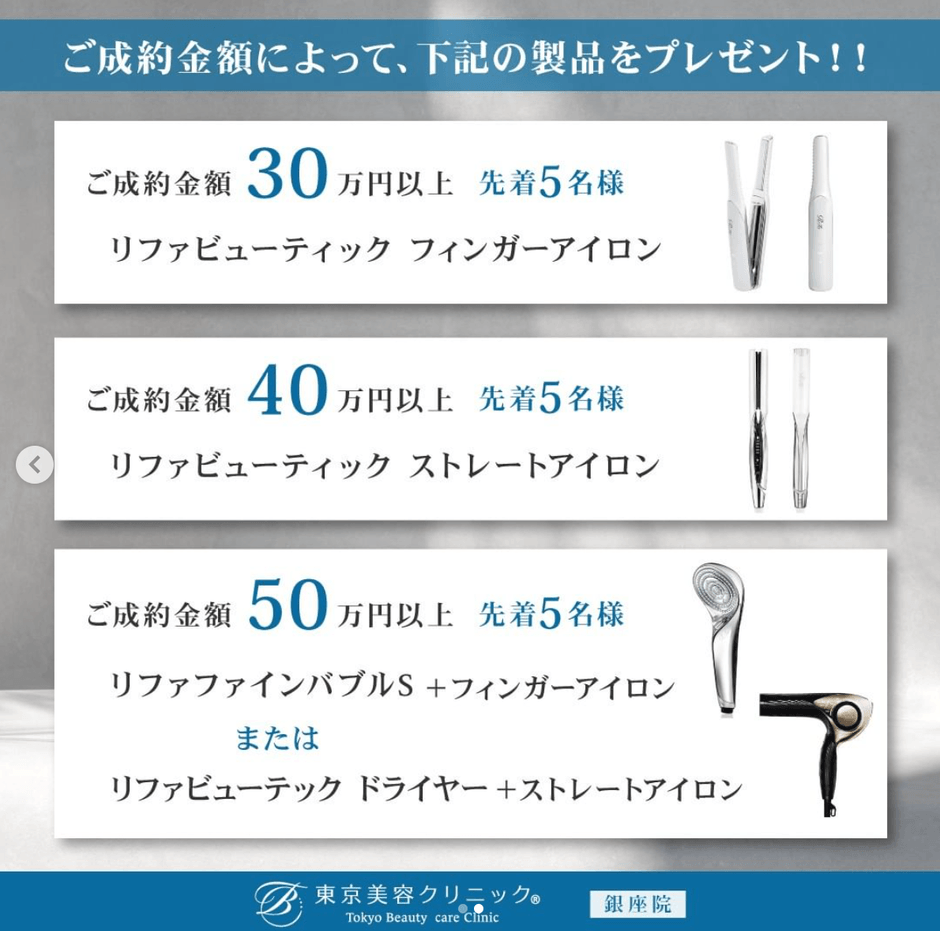 対象期間に美容外科手術をご成約いただきますと、大人気《リファ》の美容製品をプレゼントいたします。