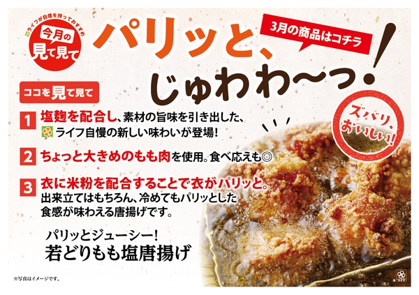 “おいしい” “ワクワク” “ハッピー” をお届けするライフコーポレーションは、近畿圏店舗で「パリッとジューシー!若どりもも塩唐揚げ 」を2月28日に新発売いたしました。