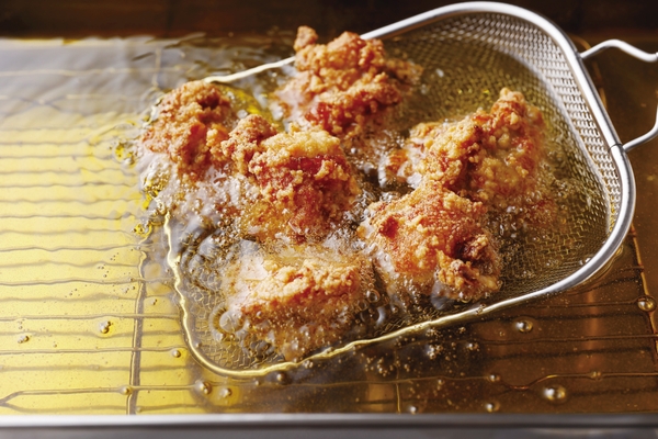 一度揚げてから余熱でじっくりと鶏肉を加熱。もう一度揚げることで、外はパリッと中はジューシーな唐揚げに!