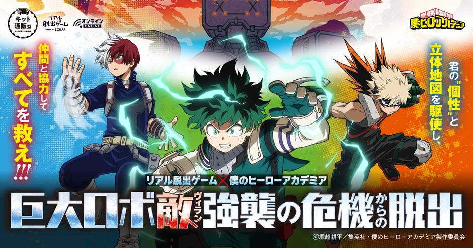 株式会社SCRAP(本社:東京都渋谷区 代表:加藤隆生)は、現在アニメ第6期が絶賛放映中の大人気アニメ『僕のヒーローアカデミア』とコラボレーションした、オンラインで遊べるリアル脱出ゲーム『巨大ロボ敵〈ヴィラン〉強襲の危機からの脱出』を本日2022年12月5日(月)より販売開始することを発表いたします。