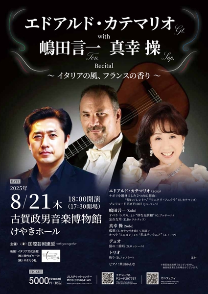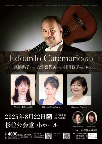 国際芸術連盟(代表:服部和彦)主催、エドアルド・カテマリオの来日公演が、2025年8月~9月の期間、東京都内にて以下の通り5公演開催されます。