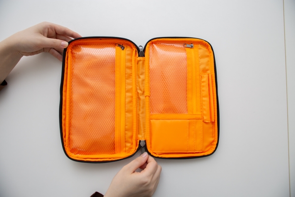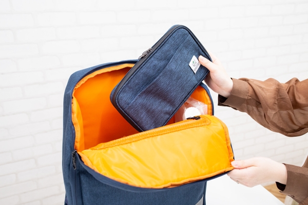 外側には落ち着いた色味のネイビー生地を採用し、シンプルで使いやすく。内側には明るいオレンジ色を採用し、何が入っているかがひと目で分かる仕様にしました。Defend Futureの防災セットと同じ色合いのため、セットアップでお使いいただくこともできます。