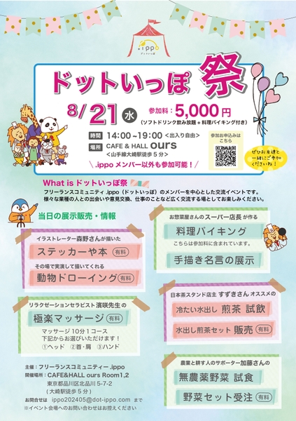 無料オープンコミュニティ「.ippo(ドットいっぽ)」を運営する合同会社KBC(神奈川県川崎市 代表社員 小林慶志郎)は、8月21日(水)に『ドットいっぽ祭(どっといっぽまつり)』というリアル開催のイベントを開催します。大崎駅から徒歩5分のキッチン付きのイベントスペースを借り切ってメンバーの”得意”を生かした交流イベントを開催します。