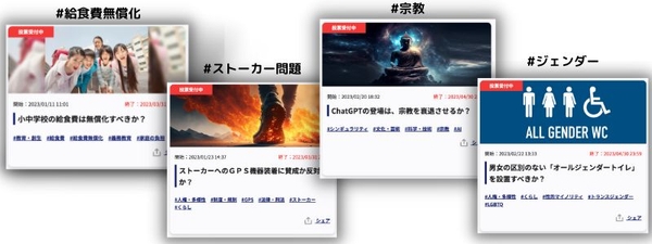 Surfvoteではユーザーがさまざまな社会課題に触れ意見を投票できる機会を作るために、幅広い分野の専門家にご協力いただきイシュー(課題)を発行しています。Surfvote上ではこの専門家を「オーサー」と呼び、現在(2023年3月2日時点)投票可能なオーサーのイシューは以下のようなものがあります。(一部抜粋)