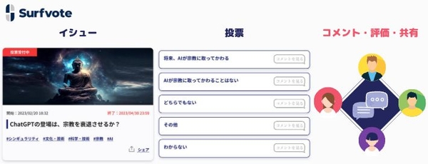 当社が提供する「Surfvote」は社会にあるさまざまな課題を問題提起し、それについて誰もが簡単に意見を投票できる目的特化型SNSです。Surfvoteでは「イシュー」と呼ばれる各テーマ(課題)に対して複数の選択肢から自分の意見を投票できます。また他のユーザーのコメントを見たり、評価(いいね)することもできます。