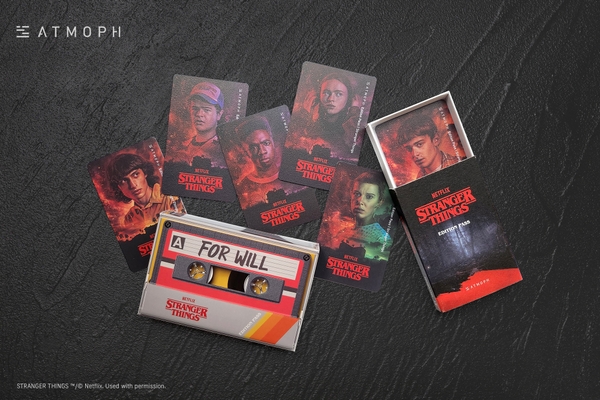 パッケージの中には、メインキャラクターがそれぞれデザインされた6種類のカードのうち1枚がランダムに梱包されています。カードに印字されている数字をAtmoph Window 2に入力すると、 『ストレンジャー・シングス 未知の世界』の中から、AtmophがオリジナルCGで再現した3シーンの風景が開放される仕組みになっています。特別パッケージは数量限定のため、お早めにご注文ください。