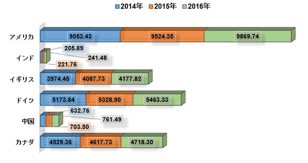 一人当たりの医療費、PPP(米ドル)– 2014-2016年