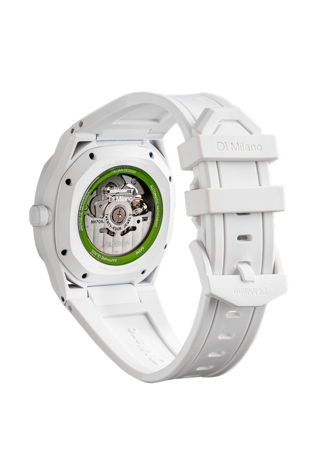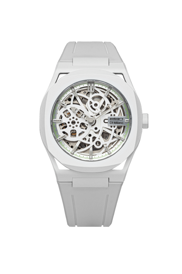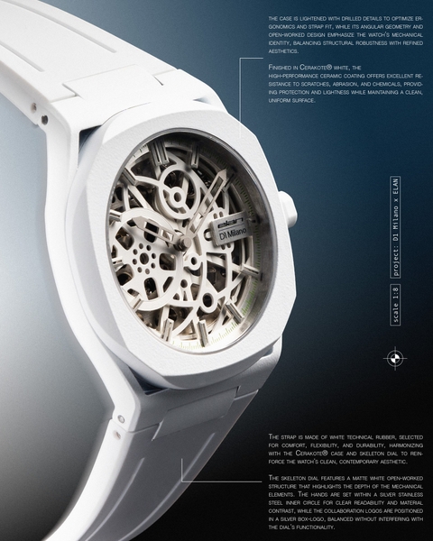 本コラボレーションは、Elan がスキーの概念を革新してきた先鋭的な設計思想と、D1 Milano が追求するミニマリズムが交差したプロジェクトです。スキーと時計。ジャンルは異なれど、「余白を削ぎ落とし、本質だけを際立たせる」という理念はひとつ。ここでの透明性は、単なるデザインテーマではなく、構造・素材・精度を“見せる”ための言語です。軽量かつシャープなドリルケース、角度を強調するオープンワーク構造、奥行きを持たせたマットホワイトのスケルトンダイヤル。視覚からも触感からも“メカニカルな本質”を感じられる設計となっています。