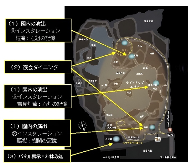 ① 旧芝離宮全景を愉(たの)しむライトアップショー「ひかりめぐる庭」