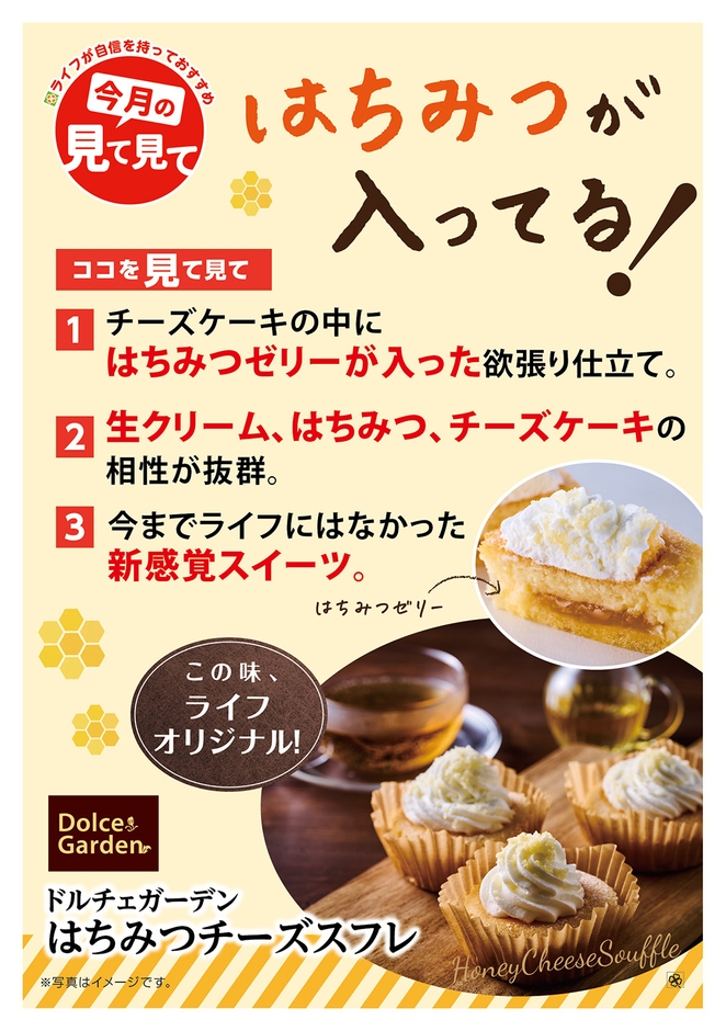 “おいしい” “ワクワク” “ハッピー” をお届けするライフコーポレーションは、「ドルチェガーデン はちみつチーズスフレ」を9月1日に近畿圏店舗で新発売いたしました。