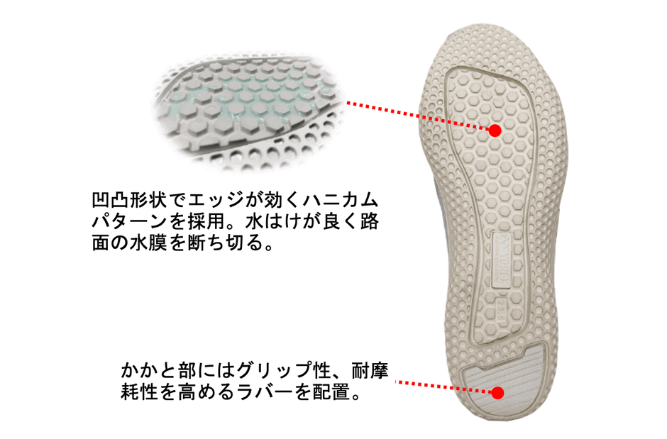 さらに、カウンター形状とかかと周りのパターンを改善し、ホールド性が向上。アウトソールには、水はけが良く、凹凸形状でエッジがきくハニカムパターンを採用。踵部には耐摩耗性に優れたラバーを採用しております。