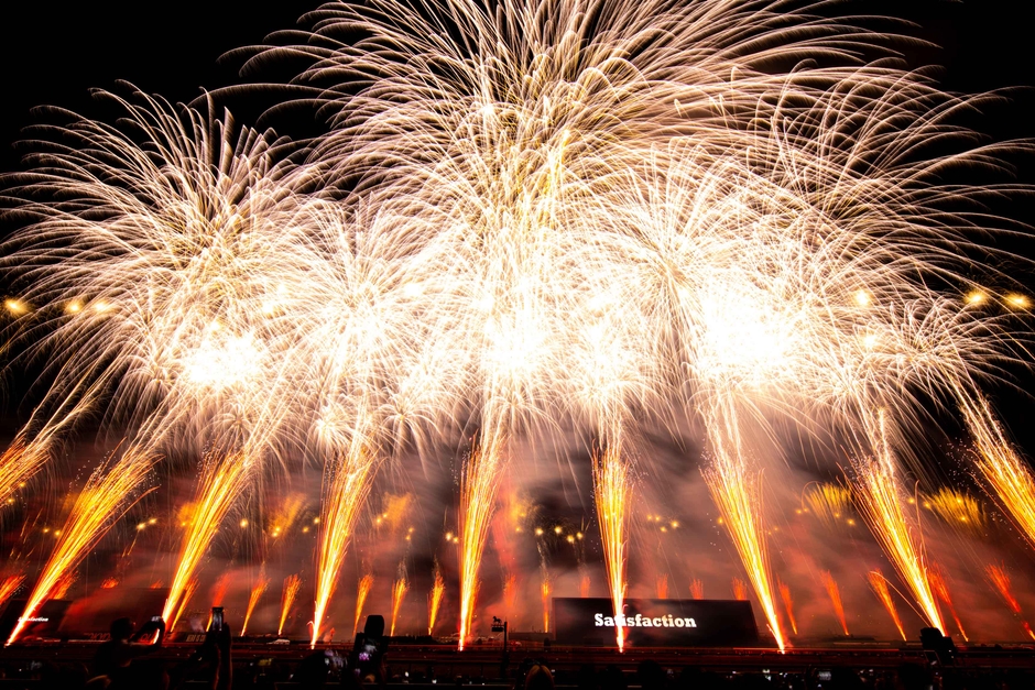 オープニングは「Continental Drift」でスタート。89年~90年の日本を含む、ワールドツアーもこの流れでライブがスタートすることが多く、ツアーを再現するかのような選曲に会場は一気にヒートアップした。本編の一曲目「Start Me Up」もライブのオープニングに選ばれることが多く、大迫力の花火と楽曲のシンクロに観客はおおいに盛り上がった。続くライブ定番曲「Brown Sugar」「Tumbling Dice」と、まさにライブさながら。また、東京競馬場にちなんでか、名バラード「Wild Horses」や、ライブで演奏されることは珍しい「She Was Hot」でも圧倒的な花火とともに夏の夜空を彩り、ファンを喜ばせた。最後を飾ったのは、65年にリリースされた彼らの代表曲「Satisfaction」のライブバージョン。81年以降はライブツアーのセットリストに定着、12年以降アンコールのラストを飾っている。2万3000人の観客を、ストーンズの音楽と、1周2㎞に及ぶ馬場を縦横無尽に駆け抜けるシンクロ率100%の豪華花火の競演で魅了した。