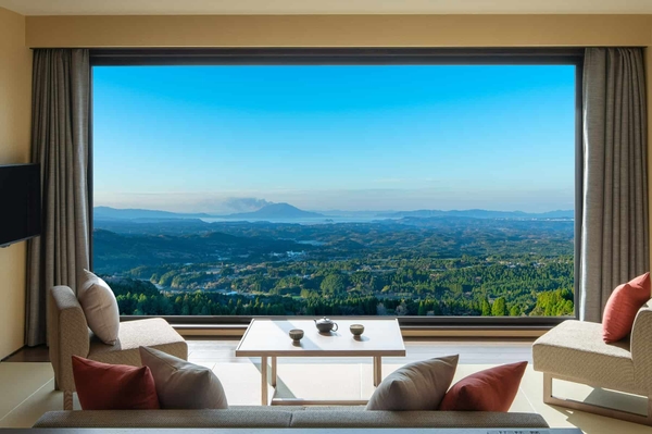 天孫降臨の地として知られる高千穂峰を含む霧島連山をはじめ、稀有な自然環境が残されているエリアです。神話が息づく高千穂峰の中腹に建ち、全室から桜島を見下ろす開放的なビューが広がります。霧島高原を見晴らす景観を眺めながら心身ともに癒される滞在を提供します。