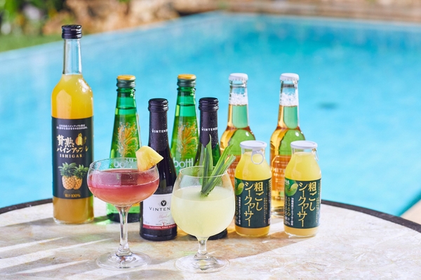 客室に用意したドリンクを組み合わせて、南の島を感じるオリジナルモクテルを作成することができます。数種類のノンアルコールワインに、南の島らしいシークヮーサーやパイナップルのジュースを合わせて、自分好みにモクテルを作成します。もちろん、それぞれのドリンクをそのまま楽しむことも可能。気軽に楽しみやすいノンアルコールドリンクが、ロイヤルスイートでの贅沢な滞在を引き立てます。
