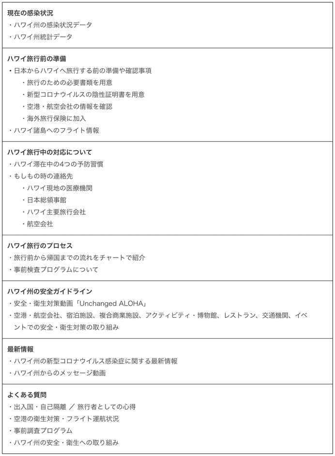 「ハワイ州 新型コロナウイルス情報サイト」では、ハワイ州の新型コロナウイルス感染症の感染状況や統計データ、ハワイ旅行前に必要な手続き、旅行中の感染防止対策、ハワイ州の安全ガイドライン、観光施設の感染防止対策への取り組み、よくある質問などを掲載しています。日本からの旅行者が安心してハワイを訪れることができるようハワイの感染状況や感染防止対策に関する情報を随時公開していきます。